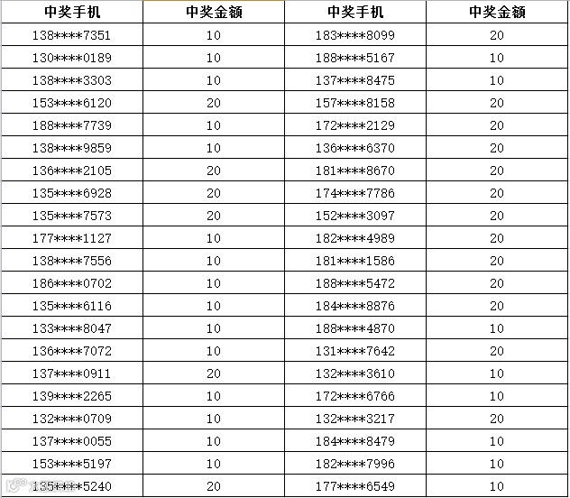 3、中奖金额将于每周五以话费的形式发放到您的中奖手机,届时敬请留意短信
