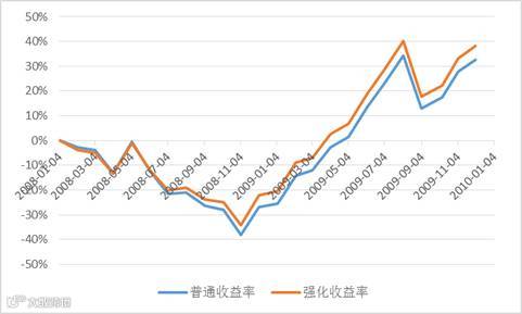 可以看到,在该区间内,强化后的定投收益率在最后明显要跑赢普通的定投收益率。