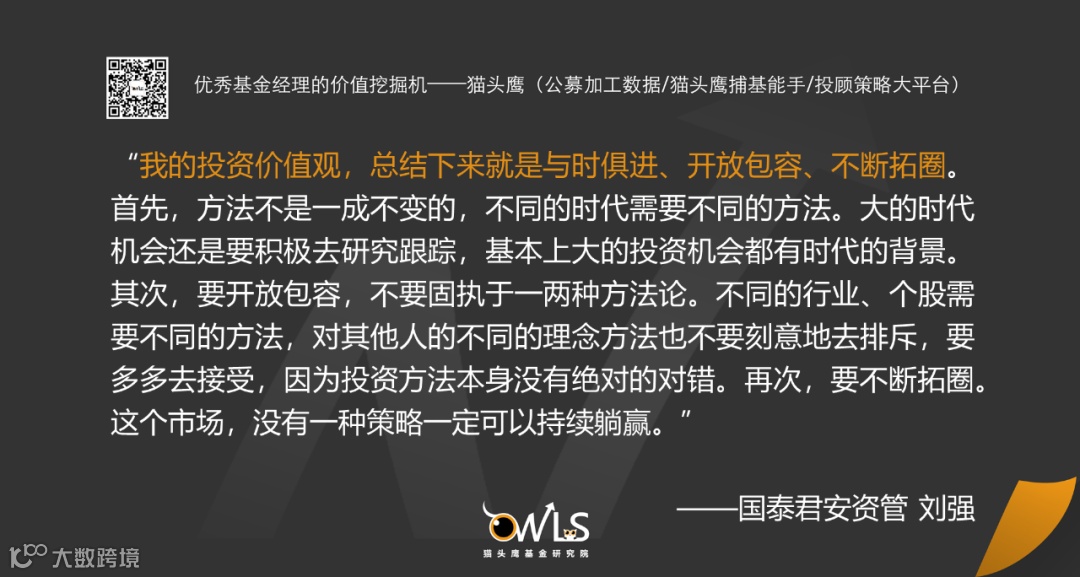 至于宏观部分,刘强表示也会关注,但主要目的在于规避系统性风险和“黑天鹅”。日常组合的超额收益,依然主要来自于中观行业和微观个股。