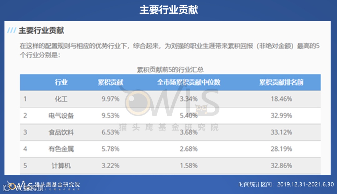 2)研究覆盖广,因而没有成为单一赛道的基金经理。而是多个行业对业绩均有贡献。