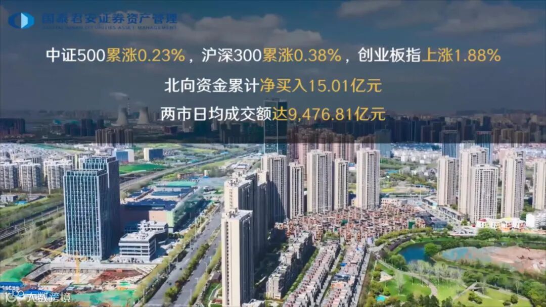 上周A股三大指数均上涨。创业板指领涨,周累计涨幅1.88%,沪深300累涨0.38%,中证500累涨0.23%。上周北向资金累计净买入超过15亿元。两市日均成交额近万亿元。