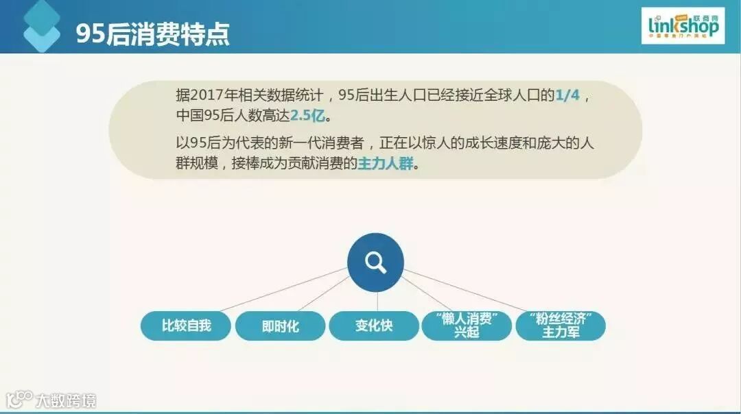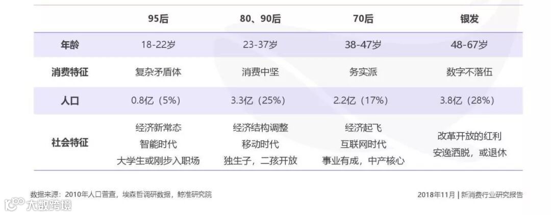 由于生长环境的不同,不同代际的消费者呈现出相当不同的消费特征和消费习惯。70,80,90,95后占总人口的47%,且有经济实力和强烈的消费诉求,是当下消费的主力军。
