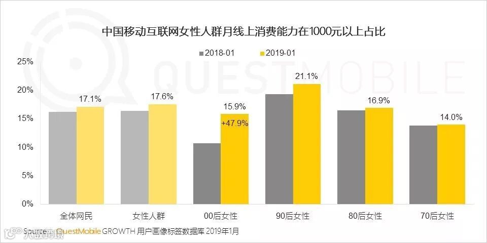 中国移动互联网女性人群消费主体地位确立,其中90后成为消费主力,线上1千元消费占比高达21.1%;而00后女生则消费力爆发,消费能力在千元以上的占比增幅接近50%。
