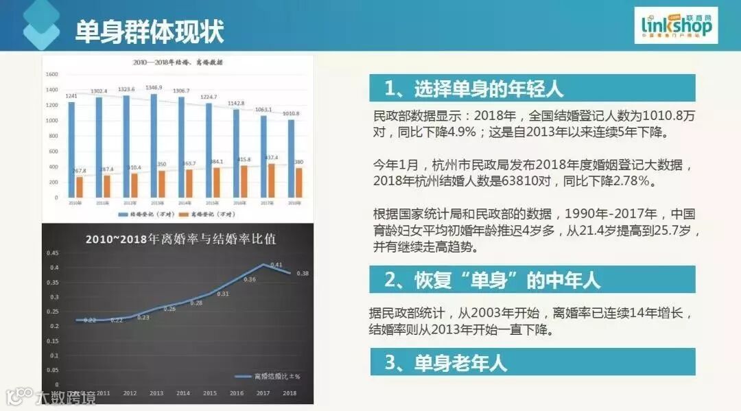 目前年轻人选择单身越来越多,民政部数据显示:2018年,全国结婚登记人数为1010.8万对,同比下降4.9%;这是自2013年以来连续5年下降。