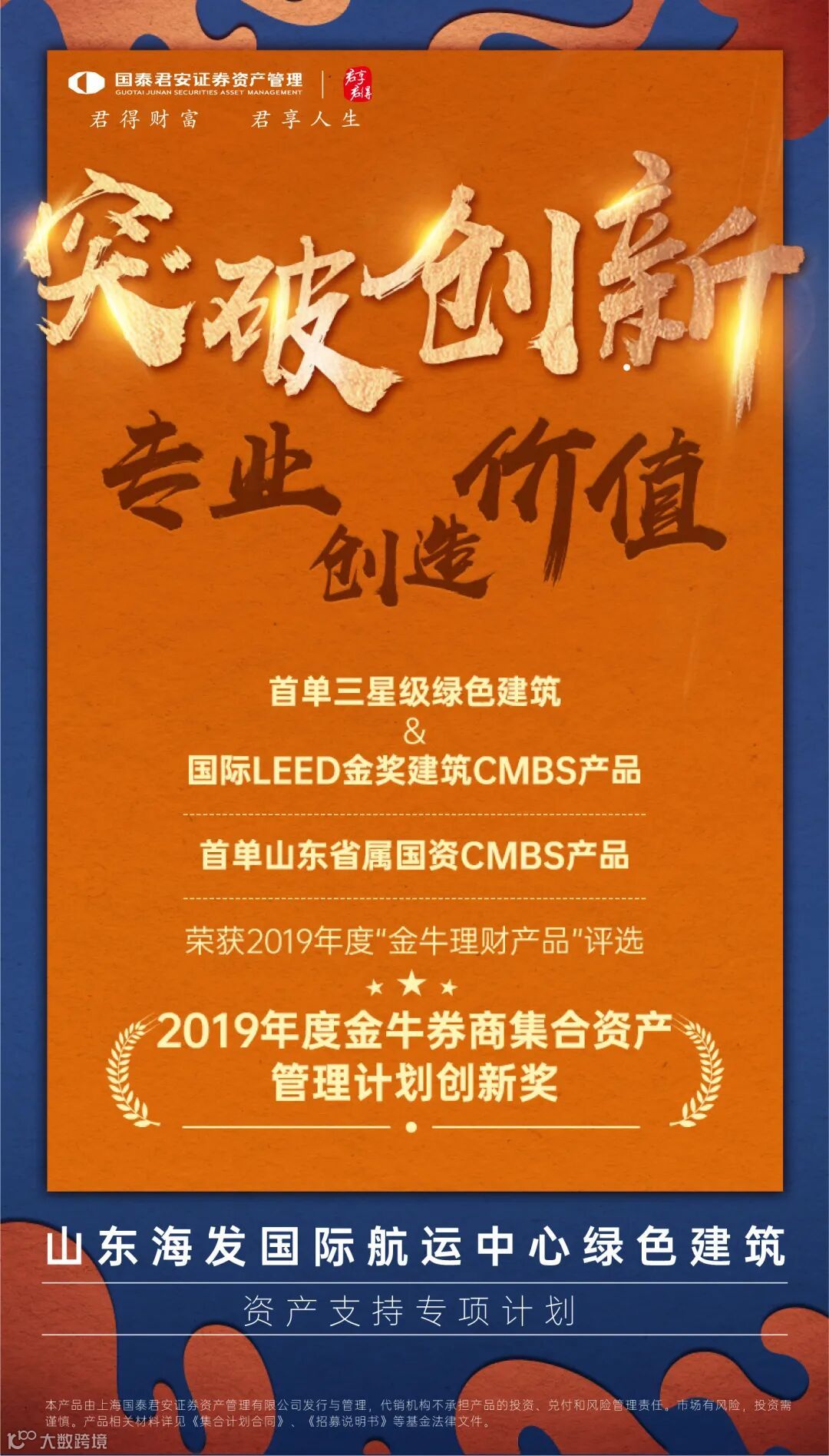 绿色ABS产品——山东海发国际航运中心绿色建筑资产支持专项计划,荣获“2019年度-金牛券商集合资产管理计划创新奖”。该专项计划系首单三星级绿色建筑和国际LEED金奖建筑CMBS产品、首单山东省属国资CMBS产品,是国君资管在绿色建筑领域金融发展的有益尝试。