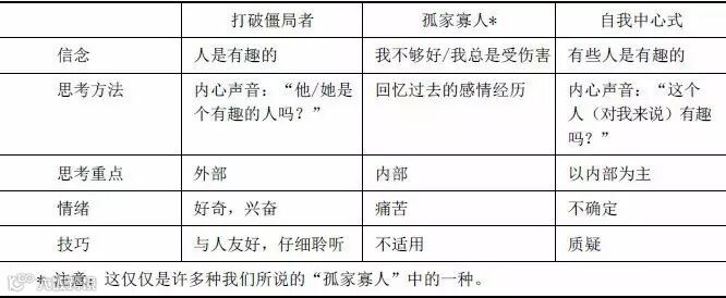 孤家寡人,或自我中心式的人可以轻松学会打破僵局者的所有技巧:如何赢得善意,如何“用你的眼睛来笑”,以及如何做一个好聆听者,等等。他甚至可以唤出那种内心的声音:“他/她是个有趣的人吗?”