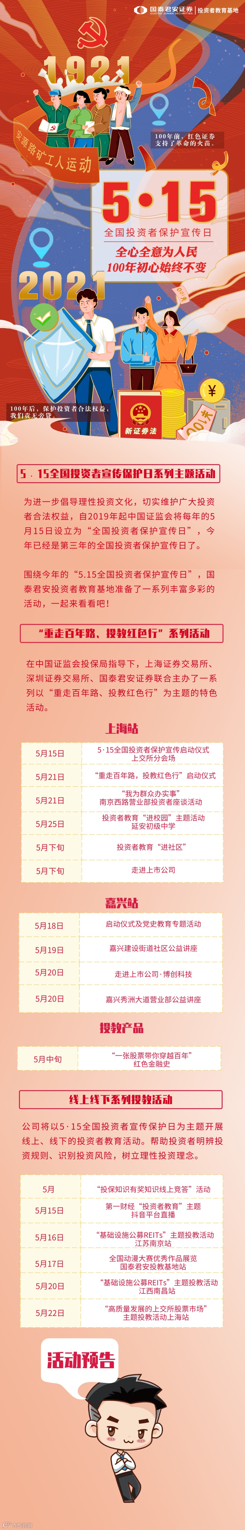 按照本次证监会投保局关于开展“重走百年路,投教红色行”专项投教活动的部署和要求,结合“我为群众办实事”实践活动,在投保局的指导下,国泰君安将在5月18日- 5月20日联合深圳证券交易所在浙江嘉兴开展投教红色行的第一站专项投教活动,通过走进嘉兴营业部、走进社区、走进上市公司开展讲解红色金融史、防非打非宣传教育活动等系列投教活动;在5月21日-5月28日公司联合上海证券交易所在上海开展投资者教育周活动,通过“六个一”活动,落实投资者教育与保护工作;此外在5月下旬,投教基地将发布“一张股票带你穿越百年”红色金融史的H5投教产品。
