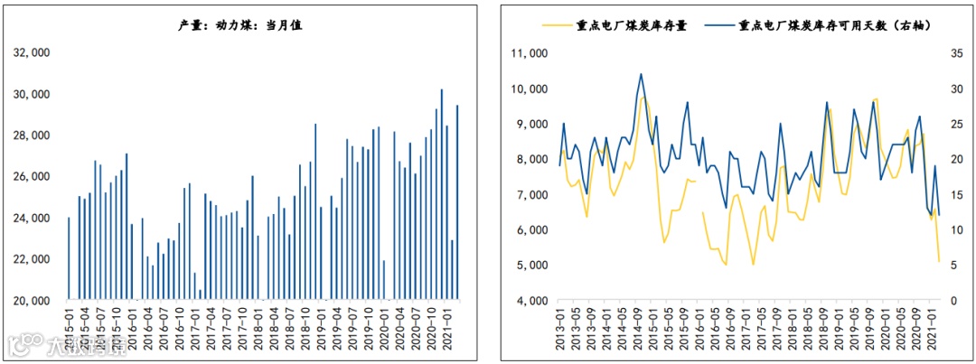 ▼图表右:重点电厂煤炭库存量及库存可用天数