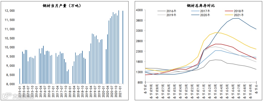 但是今年国家发改委与工信部发布的政策通知中,明确要求了钢铁去产能,提到“2021年粗钢产量压减工作 ”,这为钢材价格增加了几分不确定性。如果想要维持粗钢产量全年同比不增,那么下半年就将面临非常强劲的供给约束。