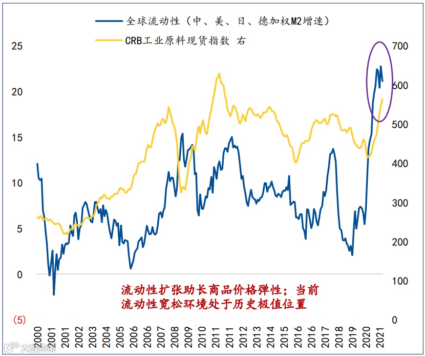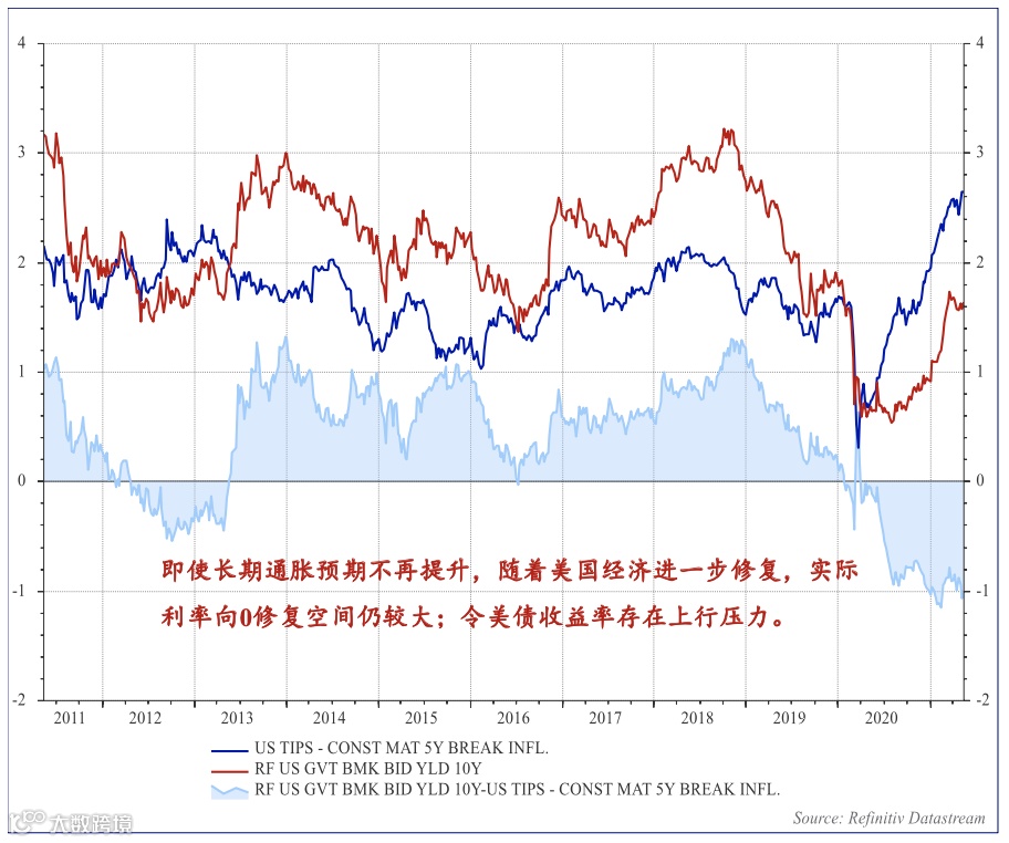 另一边,股市火热更映照出债市的相对疲软。债券作为主要债权类资产与定价锚,美债当前收益率存在一定的上行压力。由于美国十年期国债收益率位于历史高位,未来收益率进一步增长的机会不大。即使长期通货膨胀预期不再提升,实际利率下降甚至归零的概率也仍然较大,不利于美债收益率的提升。此外,目前的高流动性也是未来债券收益率的一大扰动因素。