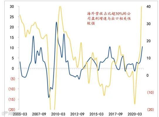 从数量上来说,我们发现,如果海外营收占到公司整体营收的比例超过30%,这类公司的盈利增速与出口的相关性较强,受益于海外经济复苏,海外需求较高,出口量也就因此增加。
