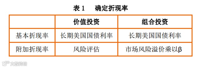 现代金融理论使用资本资产定价模型来估计股票的折现率。除无风险回报率外,使用CAPM模型需要估计两个输入参数,分别是市场风险溢价和β,其中β被理论的支持者看做度量股票起伏的风险指标。这些变量都是相互关联的,其中一个变化往往会影响其他的变化。参数估计中,主观判断的必要性以及变量间复杂的相互关系意味着审慎的分析应该涵盖多个数据点。
