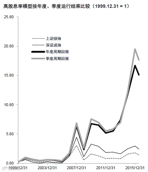 这个高股息率模型的设计细节很简单,即在每段时间开头,即T日,选择前溯12个月的累计股息,相对当前股价的股息率,最高的30个股票,然后持有一个周期(比如1年、1个季度等),在期末再重新选择30个股票,重新获取下一个周期的回报。