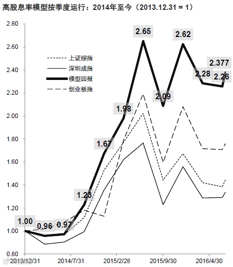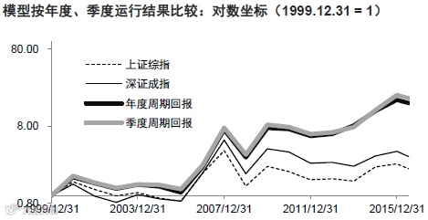 以每季度为调整周期的测算中,自2003年12月31日至2016年7月14日的、跌宕起伏的市场中,模型取得了137.7%的回报,而同期上证综指上涨44.3%,深圳成指上证33.6%,甚至是创业板指数也只上涨了75.8%。