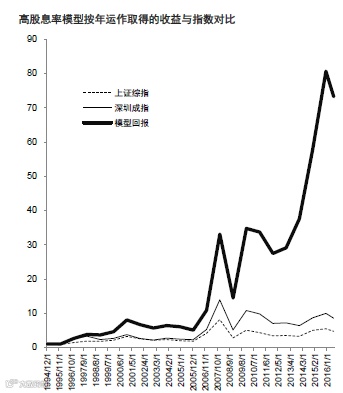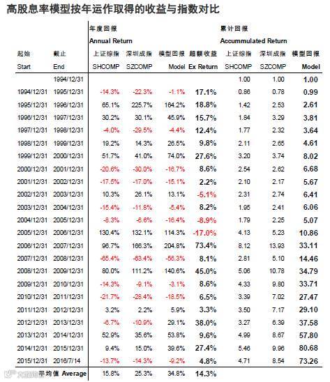 结果显示,当每年的12月31日进行持股更新、每次持有期为1年的情况下,在从1994年12月31日到2016年7月14日的约22年中,模型增长到初始值的72.3倍,而同期上证综合指数仅为原值的4.7倍,深圳成分指数为8.5倍。