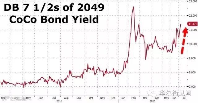 7月8日,德银的应急可转债收益率升至11.5%,仅次于意大利裕信银行(Unicredit)和西班牙桑坦德银行(Santander)同类债券收益率。