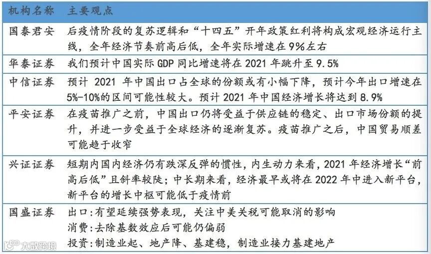 2021年,后疫情时代的复苏逻辑与“十四五”的开年政策红利将构成宏观经济的运行主线。受2020年低基数影响,各大机构对2021年的GDP增速预测平均在9%左右。