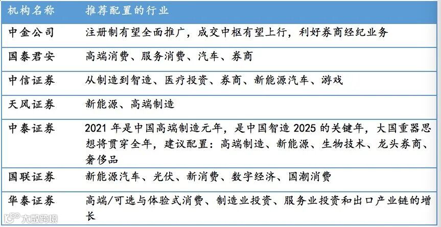 作为疫情复苏元年与“十四五”的开局之年,各大机构在2021年的投资策略上也主要遵循这两条主线进行行业配置: