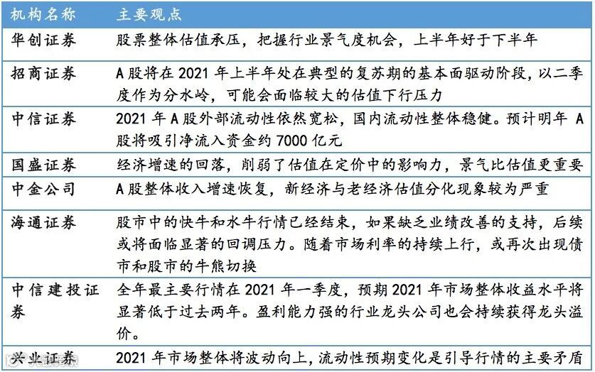 主流金融机构普遍认为2021年A股市场总体将呈前高后低的慢牛趋势,缺乏盈利的行业将面临较大的估值下行风险。