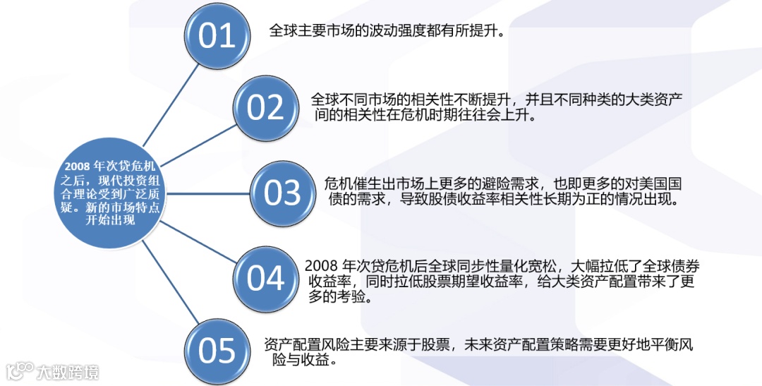 最后的第四阶段,是多项大类资产配置策略搭配的阶段。经过2008年次贷危机之后,由于各个市场波动强度提升、资产之间的相关性不断提高、甚至出现股票和债券收益率长期为正的情况,给大类资产配置带来更多的考验。毕竟对于全球资产配置策略来说,其风险仍然主要来源于股票。目前全球各大投资机构在进行资产配置时,主要根据自身的资产负债特性和风险收益偏好,在传统的资产配置理论里面,进行一些改进和创新,从而发展形成了各种风格的大类资产配置策略。