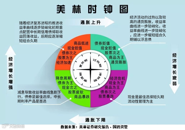 在美林时钟的理论里:滞胀期和衰退期中,持有债券资产是比较好的。