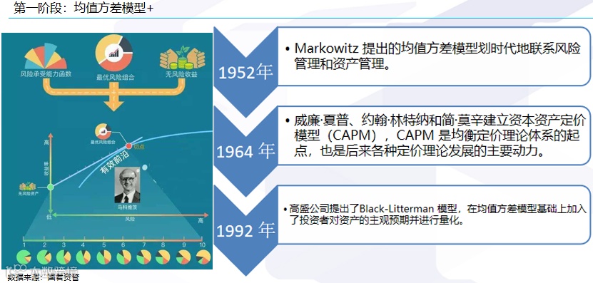 第一个阶段,是传统的均值方差模型。这个策略模型在1952年由马克维斯提出,具有划时代的意义。模型首次把风险和收益联系在了一起,这才有了资产配置的组合。随后1964年他学生夏普开发的资本资产定价模型(CAPM),以及之后1992年高盛的black litter模型,这些各具特色的模型,都是在均值方差理论基础之上进行了各种改进的结果。