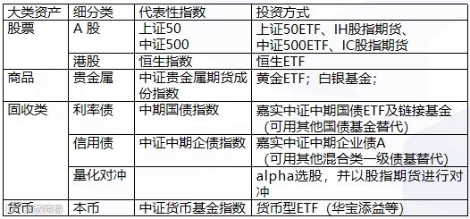 从所配置资产的选择来看。资产选择更倾向于有较好代表性、流动性及可投资性的资产。具体而言,主要是会配置使用在市场里面非常便于配置的7大资产,包括股票属性的上证50、中证500,恒生指数;大宗商品属性的黄金期货;固收属性的利率指数、国债指数、信用债和量化对冲产品;最后还包括货币。