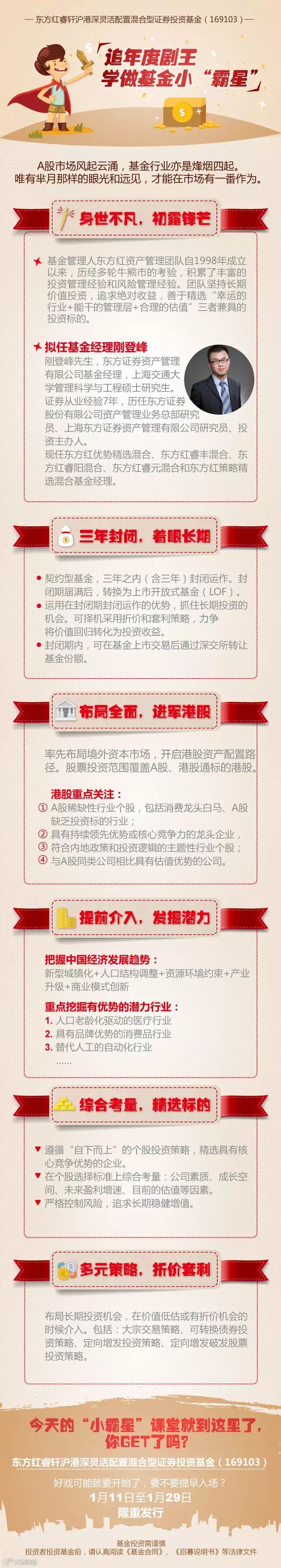 公告显示,东方红睿轩沪港深混合基金兼顾沪港深三地市场,积极把握由新型城镇化、人口结构调整、资源环境约束、产业升级、商业模式创新等大趋势带来的投资机会,挖掘重点行业中的优势个股,自下而上精选具有核心竞争优势的企业,分享转型期中国经济增长的成果,在控制风险的前提下,追求基金资产的长期稳健增值。