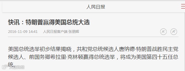 据人民日报客户端消息,美国当地时间11月9日凌晨,唐纳德•特朗普率先获得超过270张选举人票,当选新一任美国总统。