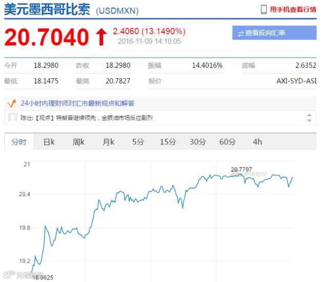 ▲美元对墨西哥比索汇率走势(截至北京时间14点09分,越往高走,代表美元升值)