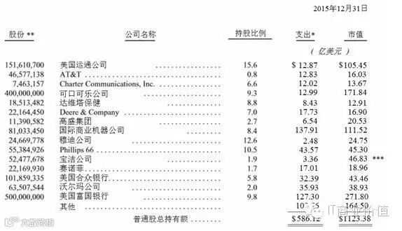 下图为截至去年年底,我们投资的普通股中市场价值最大的15家公司。卡夫亨氏公司(Kraft Heinz)并未列入排名,因为我们实际上拥有公司控制权,根据“权益法”,我们对其盈亏需承担责任。