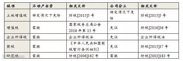 以不动产出资设立新项目公司或公司分立过程中,主要可能涉及到的税费包括五类税费:土地增值税、增值税、企业所得税、契税和印花税。