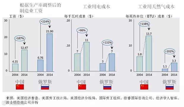 》能源成本。自2004年来,由于页岩天然气资源的大规模开采,北美天然气的价格已经下降了25%-35%。相比之下,波兰、俄罗斯、韩国和泰国等经济体的天然气价格上升了100%-200%。这对使用天然气作为生产进料的化工产业产生巨大影响。类似地,澳大利亚、巴西和西班牙等制造业经济体的工业用电价格也大幅上升。因此,北美以外很多经济体的整体能源成本都比2004年上升了50%-200%。这明显地改变了各国依赖能源的产业的竞争力。