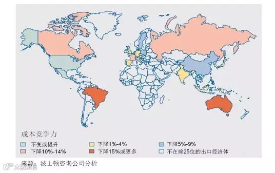 》面临压力:过去一直被认为是低成本制造业基地的几个经济体由于多项因素结合,自2004年来面临着成本优势大幅减弱的压力。例如:据估计,中国相对美国的工厂制造业成本优势已经减弱到5%以下;巴西的制造业成本高于西欧;波兰、捷克共和国和俄罗斯的成本竞争力也相对减弱,目前它们的制造业成本水平与美国相当,仅仅比英国和西班牙低几个百分点。