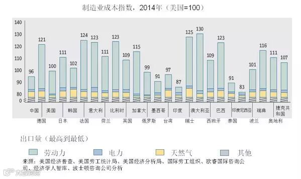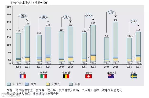 》继续削弱:几个过去十年制造业成本就相对高的经济体竞争力继续削弱,它们的制造业成本高于美国16%-30%。主要原因是生产率的低增长和能源成本提高。竞争力继续削弱的经济体包括:澳大利亚、比利时、法国、意大利、瑞典和瑞士。
