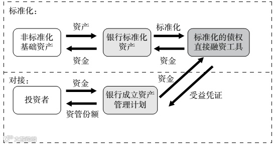 债权直接融资工具将非标资产变成标准化产品,是对资产的筛选处理;而银行资管计划属于银行资产管理业务,作为直接融资的载体,处于资金端。银行资管计划和债权直接融资工具可构建与表内信贷并行的表外信贷资金链,资金的流向为:投资者→银行资管计划→基础资产标准化形成的金融产品组合(含债权直接融资工具)(见图3)。