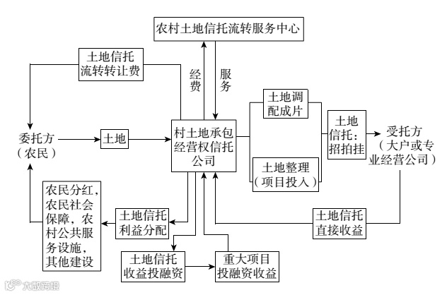 《国家新型城镇化规划(2014—2020年)》要求加快建立城乡统一的建设用地市场,保障农民公平分享土地增值收益。在夯实土地权能的基础上,通过承包权与经营权的分离,一系列金融创新将会被有效激发出来,带动高效生产力顺利进入农村,在土地生产上得到有效释放,并通过政策为农民带来原来所不能想象的高收益,进而推动城乡生产要素的有效流动。土地流转信托就是此类金融创新之一(见图2)。土地流转信托是指在坚持土地集体所有制和保障农民承包权的前提下,由政府出资设立的信托中介服务机构接受农民的委托,按照土地使用权市场化的需求,通过规范的程序,将土地经营权在一定期限内依法自愿、有偿转让给其他公民或法人进行农业开发经营活动。作为新生事物,土地流转信托正处于萌芽期,许多风险因素尚不能较为完全的暴露,因此,选择那些已有土地流转以及集约化、产业化生产基础的地方可以有效降低经营风险。但是,在目前的土地流转信托业务实践中,尚存在信息不透明与收益管理不规范的问题。
