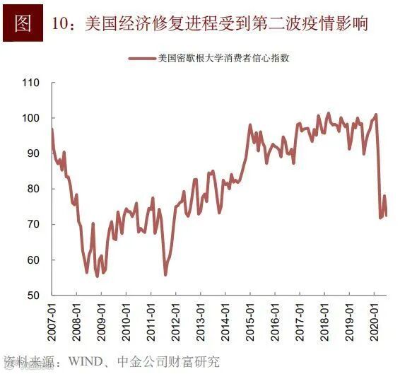 6月中下旬美国疫情反弹,部分州被迫暂缓开放经济甚至重新封锁,居民消费信心指数等高频数据显示美国经济修复将在7月停滞。