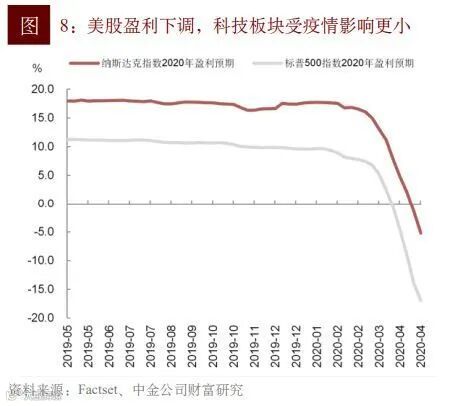 相对看好科技股。基于当前的市场预期和估值水平,若5月美国各州陆续复工导致疫情反复,市场波动可能加大。考虑到科技板块的基本面受疫情影响更小(Factset显示当前分析师一致预期标普500指数2020年盈利增速下降16.9%,而科技股更为集中的纳斯达克指数盈利预期降幅仅5.2%),疫情反复给科技股带来的回调风险相对更低,建议投资者在配置上侧重此板块。
