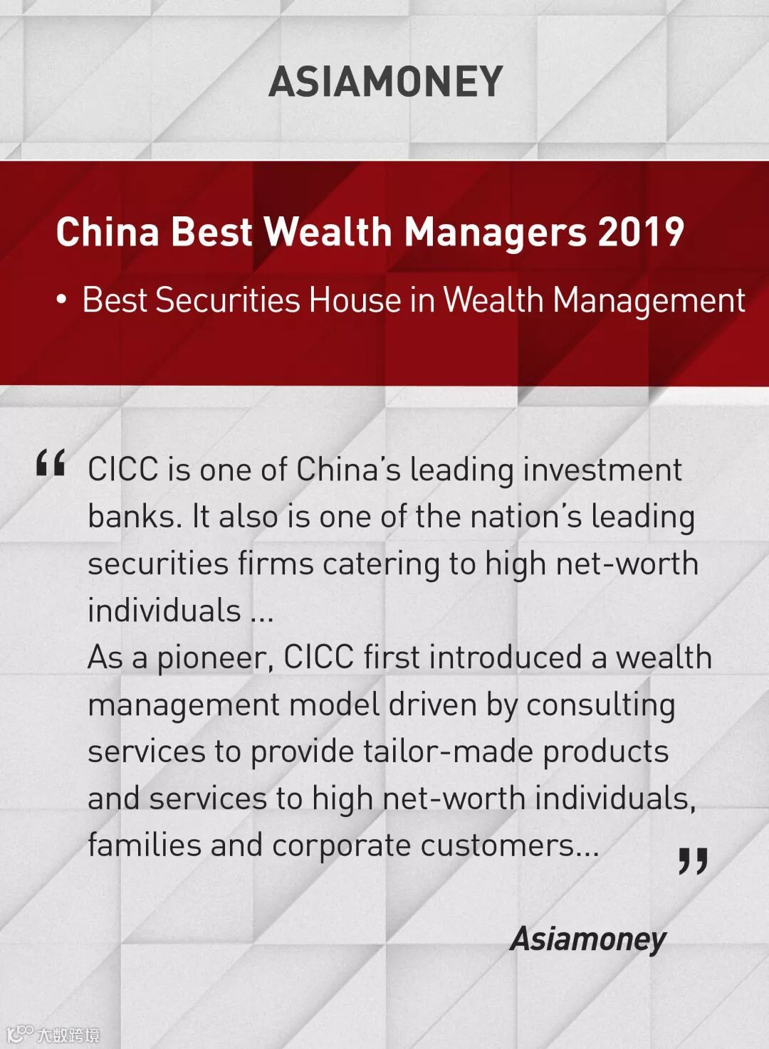 Asiamoney released the full results of its China Best Wealth Managers Award 2019 today, in which CICC achieved great result. By leveraging on its professional knowledge and quality customer services, CICC won the heavy-weight title, Best Securities House in Wealth Management. This is a tremendous achievement among so many competitors in the market.