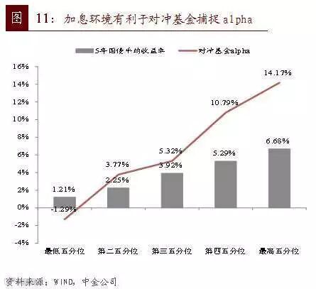 海外对冲基金截止今年9月ytd为1.45%。分策略看,表现较好的依次为相对价值(3.19%)、事件驱动(2.34%)、股票多空(1.85%),只有全球宏观策略今年亏损,ytd为-1.82%。对冲基金相较权益资产波动和回撤更小,有较好的组合保护作用,美股基本面持续向好,但对通胀的担忧亦逐步增加,另外美联储加息、地缘政治冲突、贸易战、欧洲政局的动荡等都对市场稳定带来了较大挑战。在这样的环境中,我们强调对冲基金分散风险的配置价值,建议适度高配海外对冲基金。另一方面,加息环境有利于对冲基金捕捉alpha,历史数据显示,在利率水平较高时,对冲基金平均alpha也较高。