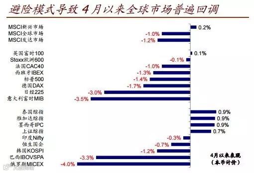 地缘风险下避险情绪短期占据主导。4月以来,全球地缘局势骤然紧张。美国军事打击叙利亚、以及阿富汗境内ISIS…特别是朝鲜问题不断升温,都使得全球市场进入避险模式。在这一背景下,避险资产如黄金、债券、防御性板块都受到资金追捧,而风险资产如股市、特别是前期累计涨幅较多的周期股等则因此承压。这一切换恰与前期偏好风险资产的“特朗普交易”背道而驰,故也成为促使其逆转的原因之一。