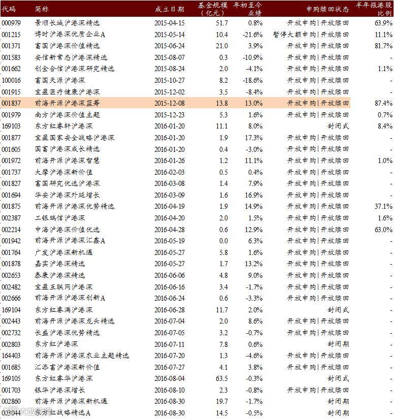 从港股持仓比例来看,目前从已公布的基金半年报中可以发现,35支沪港深基金中“成色最纯”的非前海开源沪港深蓝筹(001837)莫属,其港股持仓比例达到87%,且成立时间较长,是前海开源基金旗下首支沪港深基金,规模达13.8亿元,今年以来涨幅13%,总体表现稳健。