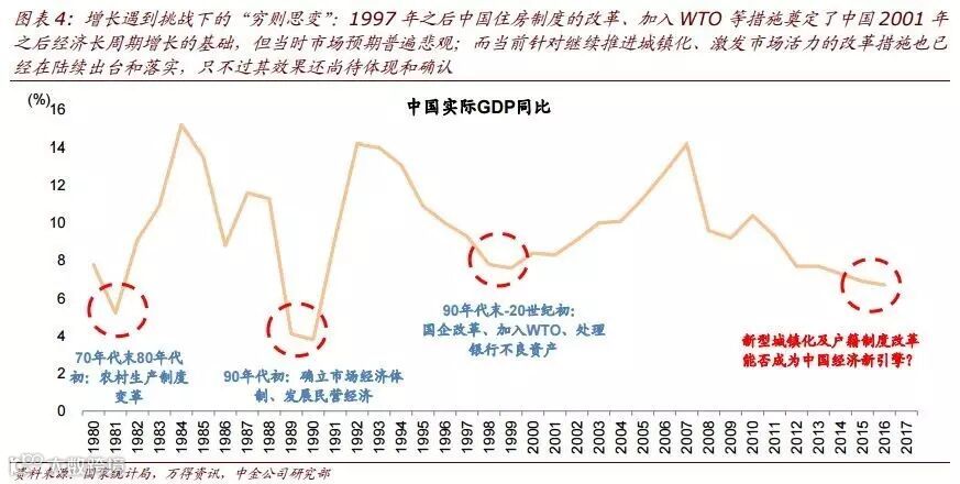 (5)释放中长期增长潜力的改革措施逐步出台,但市场一致评价偏悲观。回顾来看,1997年之后中国住房制度的改革、加入WTO等措施奠定了中国2001年之后经济长周期增长的基础。而当前针对继续推进城镇化、激发市场活力的改革措施也已经在陆续出台和落实,只不过其效果还尚待体现和确认。