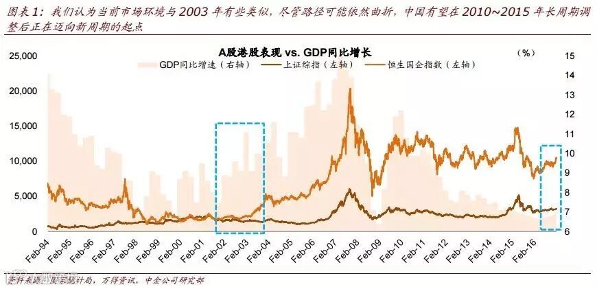 当前A/H两地市场表现也与当时的周期呈现一定的类似性:H股因为估值低、更注重盈利复苏已经开启上涨,而A股则因为估值相对高、受国内流动性收缩压制而走势暂时相对犹豫。值得注意的是,相比2003年中国经济体量已经显著增大、潜在增速已经有所下降、局部房价高企、外需潜力也有所下降,我们并不预期在潜在新周期中国增速重新回到2003年之后的水平,但即便如此已经好于“中国增速将继续持续下降”、“中国面临诸多难以逾越的挑战”等预期,已经足以支持“中国资产”开始逐步重估(参见海外中资股年度展望《2017:中国重估继续》)。