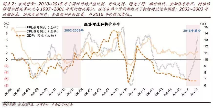 (1)经济在之前都经历长周期持续调整:2010~2015年中国经历的产能过剩、外需走弱、增速下滑、物价低迷、金融体系承压、持续的保增长措施等状况与1997~2001年间的情况类似,经济在两个阶段都经历了持续的低迷和调整。