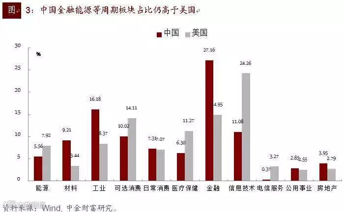 值得一提的是,A股金融行业市值占比在过去十几年中出现趋势性下行,从2006年41%下降到现在的27% ,取而代之的是科技、医疗和消费等新经济板块。这与经济转型升级的脉络是一致的,美国也有类似的现象。与美国15%的金融业占比相比,我国金融业占比目前仍然偏高(如图3)。
