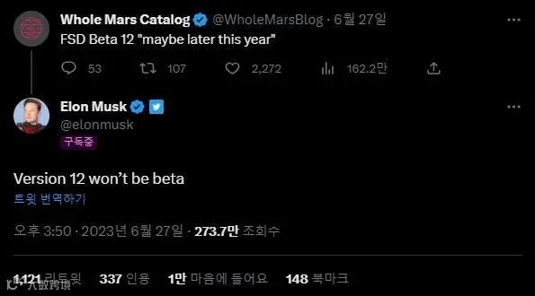 马斯克表示:“V12不会是测试版。”