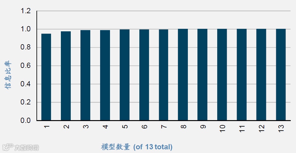 图1比较了所有模型1999年1月至2016年6月之间的业绩表现,图2比较了所有模型的信息比率,信息比率衡量了特定风险水平下的回报率。可以看到,13个模型的业绩表现在整体上是一致的,平均信息比率为0.95,最大值为1.10。