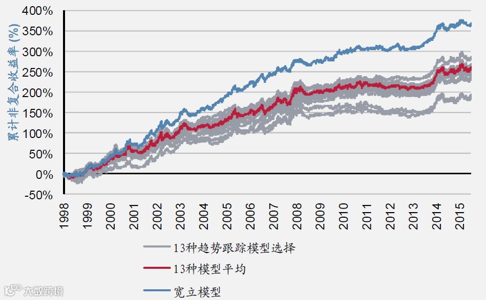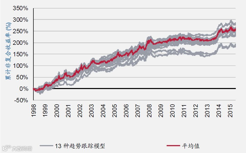 图1:1999年1月至2016年6月期间的趋势跟踪模型和13种模型的平均表现